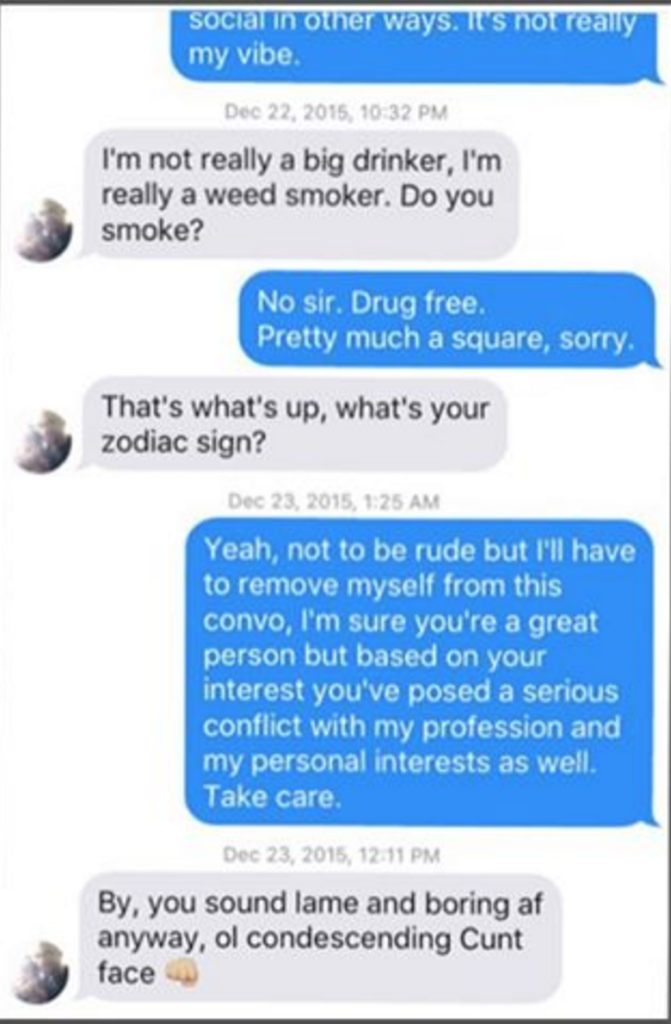 The furor that rejection causes in men is appalling and downright inexcusable. Don't believe me? Look up #byefelipe on Instagram for reference. It boggles my mind at what women deal with not only in the world of online dating, but simply just going through life on a day to day basis. I don't have to deal with women calling me names, shaming me, or getting irate when I don't respond to their messages in an online dating app. So many men think it's funny to joke about raping and acting violently against women as if that woman isn't a human being. This is scary shit and, aside from being unacceptable behavior, is sociopathic.